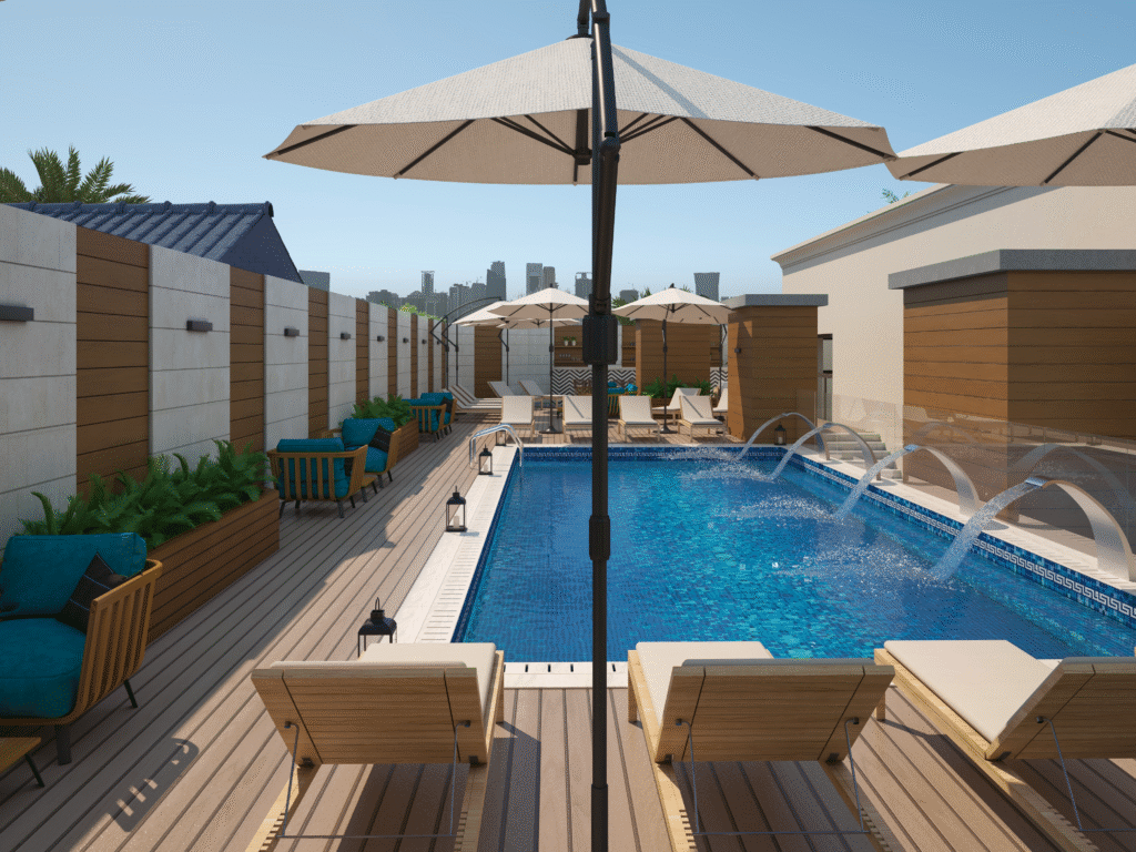 Facilities included: Mixed gym, Reception, Swimming pool, Club house, Restaurant, Coffee shop, Roof café bar